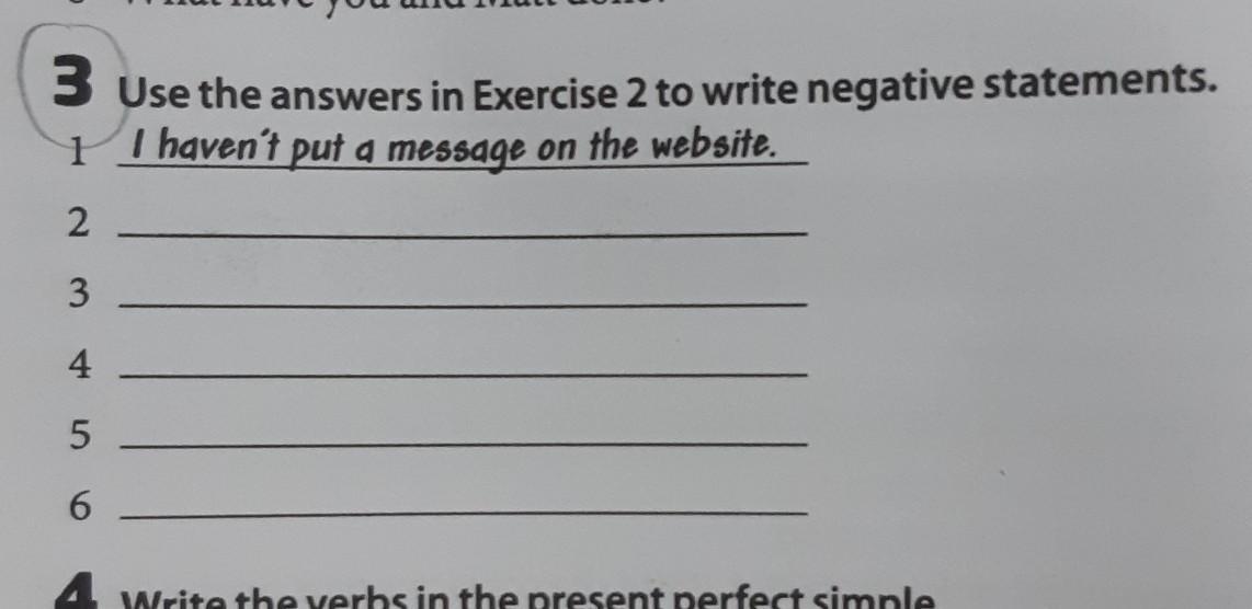 6 What have you and 3 Use the answers in Exercise 2 to write negative statements. I haven't put a message on the website, 1 2. 3 4 5 6 erfect simple