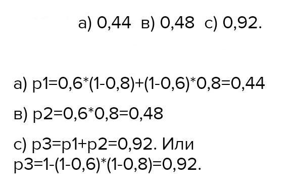1) 0,9*0,7*0,4 + 0,9*0,6*0,3 + 0,7*0,6*0,1 2) 1 - 0,1*0,3*0,4