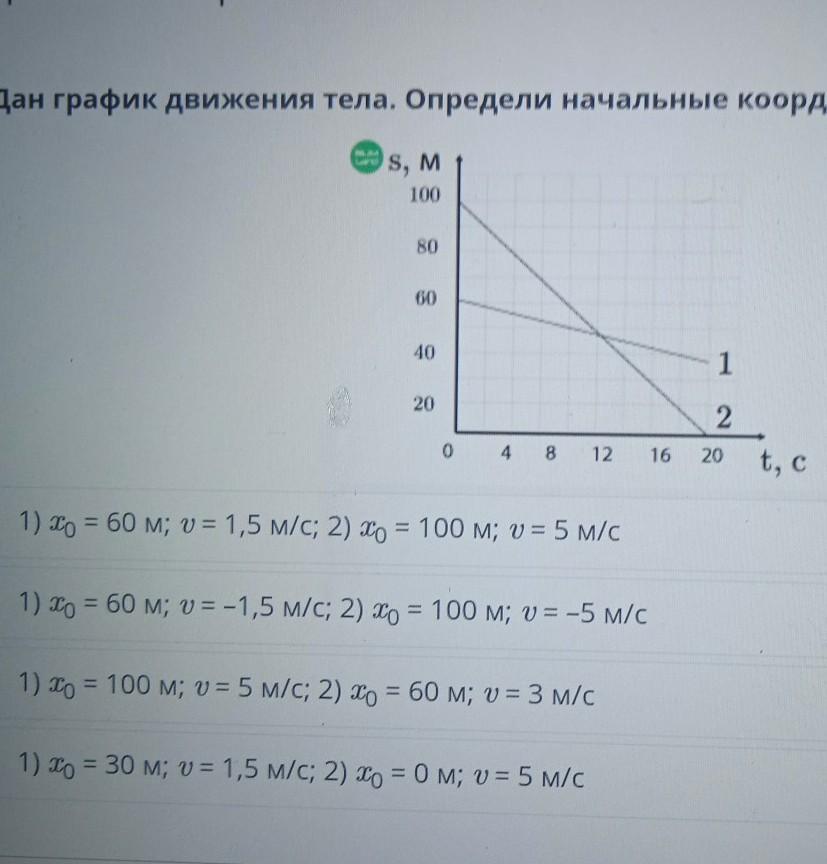 я нажала на угат и правильно ответ: 1) х0=60 м;u=-1,5м/с;2)х0=100м;u=-5м/с