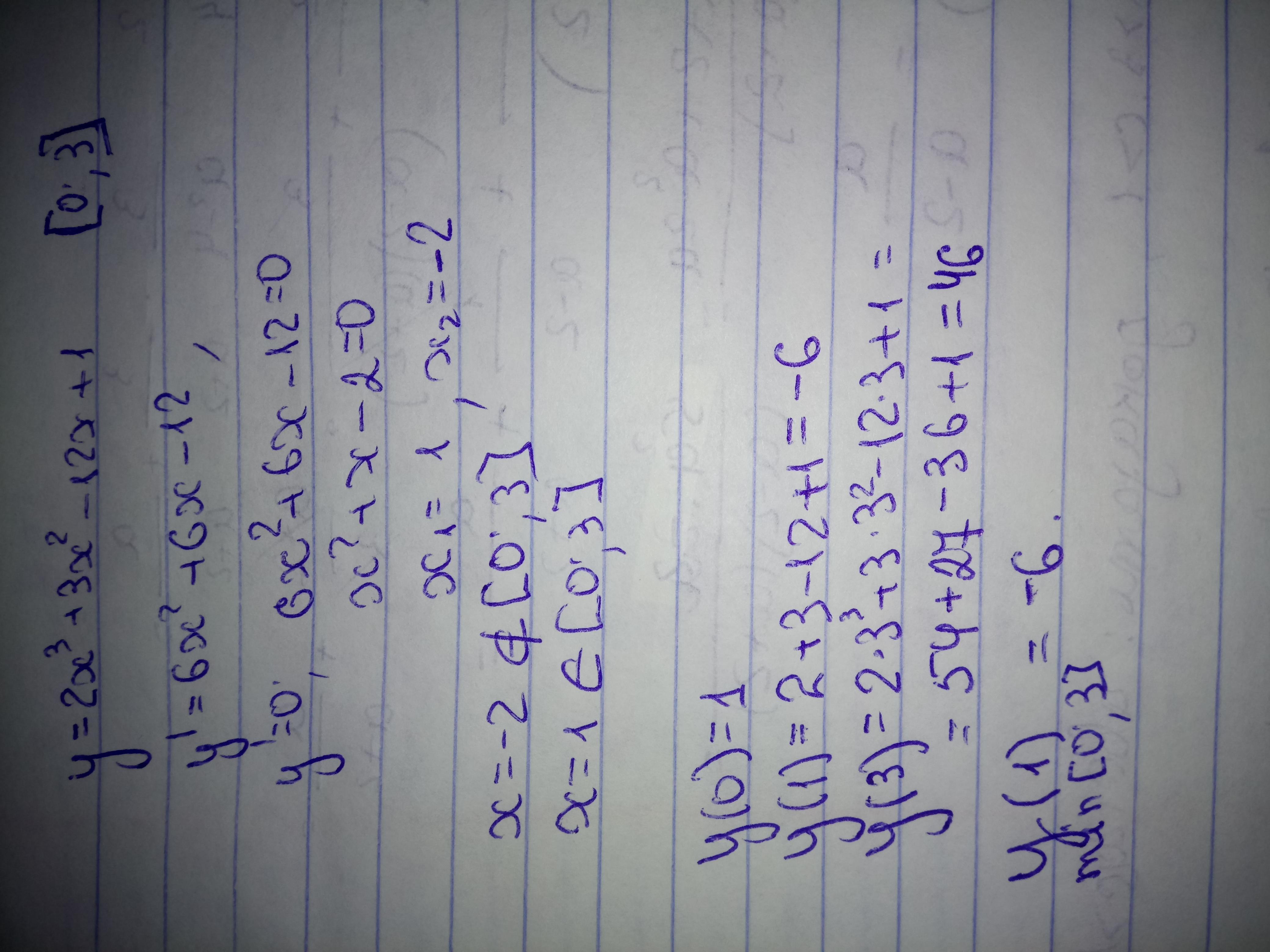 Зайдіть найменше значення функції y=2x^3+3x^2-12x+1 на проміжку (0;3)