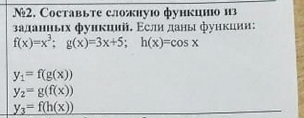 Составьте сложную функцию из заданных функций. Если даны функции: f(x)=x³ ; g(x)=3x+5 ; h(x)=cos x