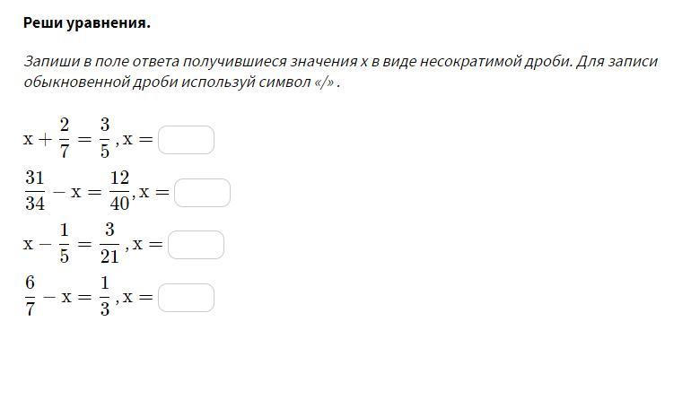 Запиши в поле ответа получившиеся значения х в виде несократимой дроби. Для записи обыкновенной дроби используй символ «/» .