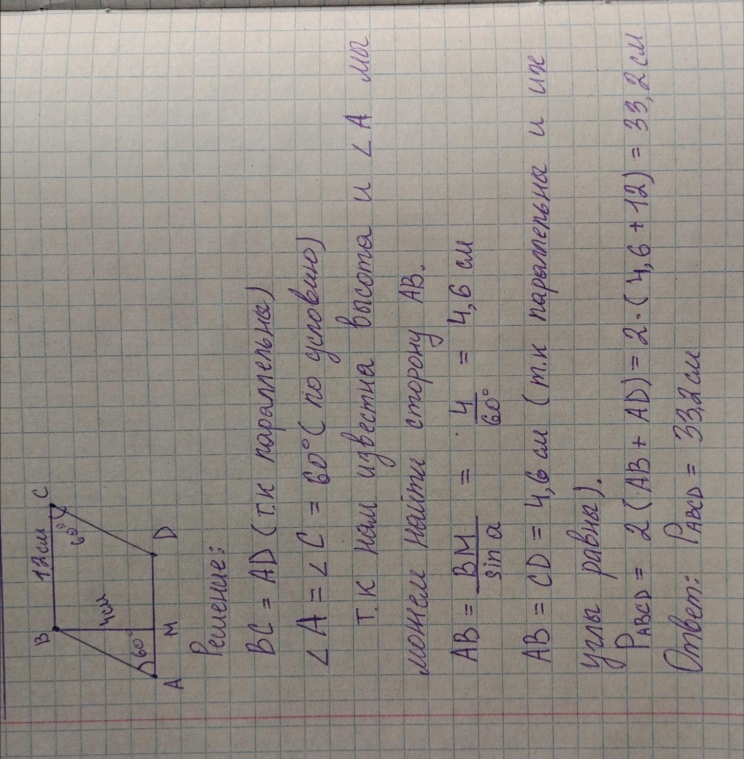 Сумма двух противоположных углов параллелограмма ABCD, 60 градусов и BC=12см. Известно, что BM перпендикулярен AD и BM=4см. Найти периметр параллелограмма.
