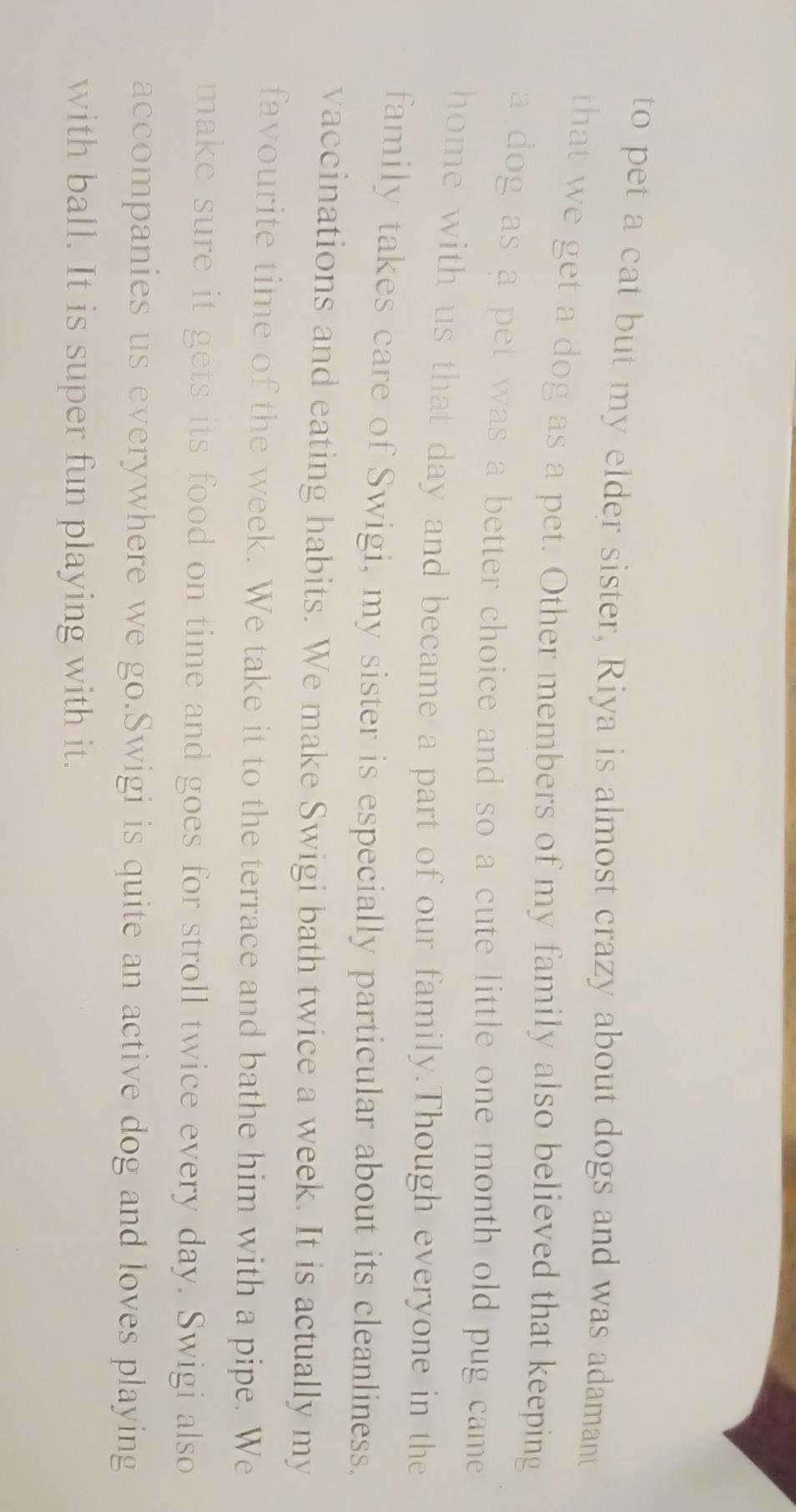 ....завести кота (?), но моя старшая сестра Рия почти без ума от собак и она была непреклонна в том, чтобы мы завели собаку. Другие члены моей семьи тоже считали, что содержать собаку в качестве питомца было лучшим выбором, так маленький милый месячный щенок мопс пришёл с нами домой в тот день и стал частью нашей семьи. Хотя все в доме заботились о Свиги, моя сестра особенно щепетильно относилась к его чистоте, вакцинациям и привычкам питания. Мы купаем Свиги два раза в неделю. Вообще, это моё любое время недели. Мы выводим его на террасу и купаем его с помощью шланга. Мы следим за тем, чтобы он получал еду вовремя и ходил гулять два раза в день. Свиги также сопровождает нас, куда бы мы не шли. Свиги очень активный пёс и любит играть с мячом. С ним очень весело играть.