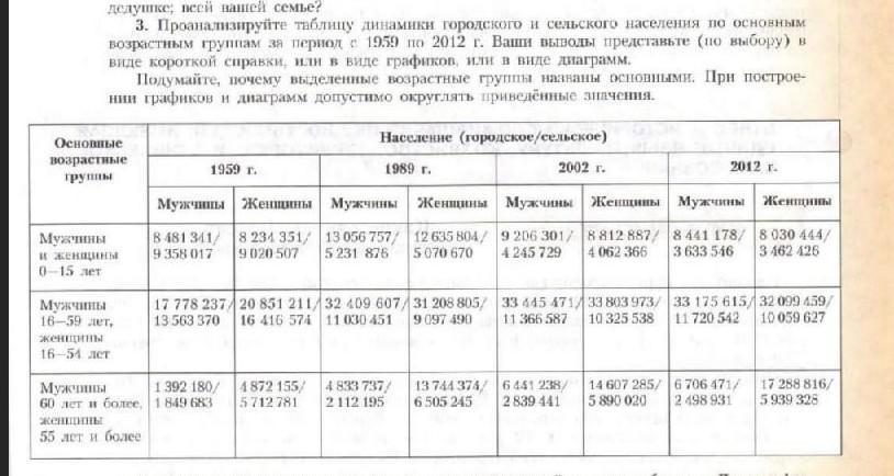 Исходя их таблицы динамики городского и сельского населения, чётко просматривается снижение доли детей (и мальчиков, и девочек) в сельской местности с 1959 по 2018 годы. Доля детей (и мальчиков, и девочек) в городах с 1959 по 1989 год увеличивалась, затек к 2002 году сократилась примерно на 4 млн человек (примерно на треть от цифр 1989 года) и к 2018 году вновь увеличилась.