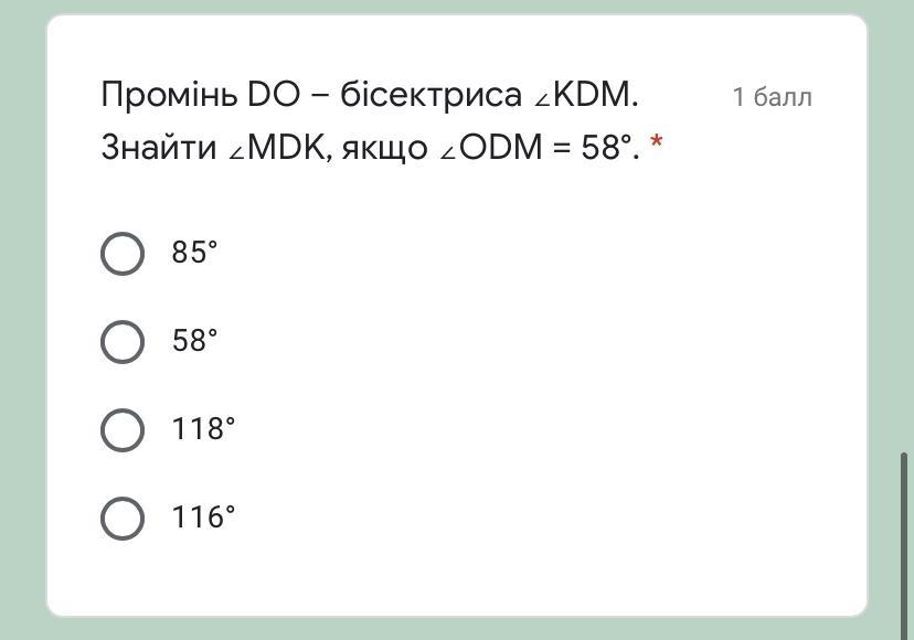 Бісектриса ділить кут навпіл, отже кут MDK дорівнює двом кутам ODM і дорівнює 2×58°=116°.