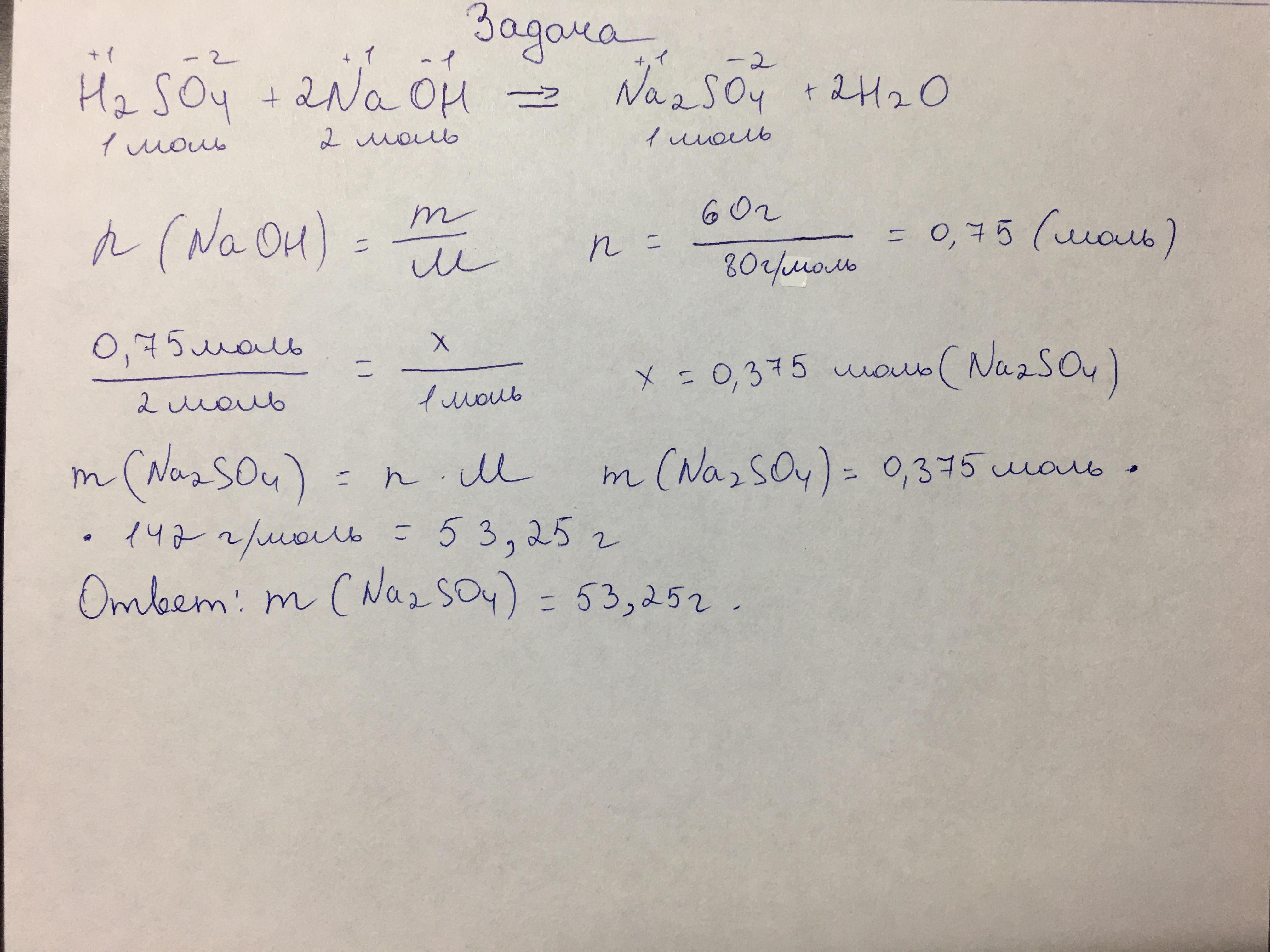 Объяснение: если кратко, сначала пишешь уравнение реакции, потом находишь количество вещества гидроксида натрия по формуле. Далее составляем пропорцию, где за «x» берем количество вещества в сульфате натрия, потом по еще одной формуле находим массу данной соли.