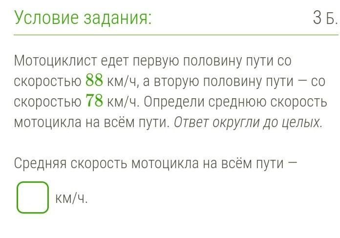 Мотоциклист едет первую половину пути со скоростью 88 км/ч, а вторую половину пути — со скоростью 78 км/ч. Определи среднюю скорость мотоцикла на всём пути. Ответ округли до целых.