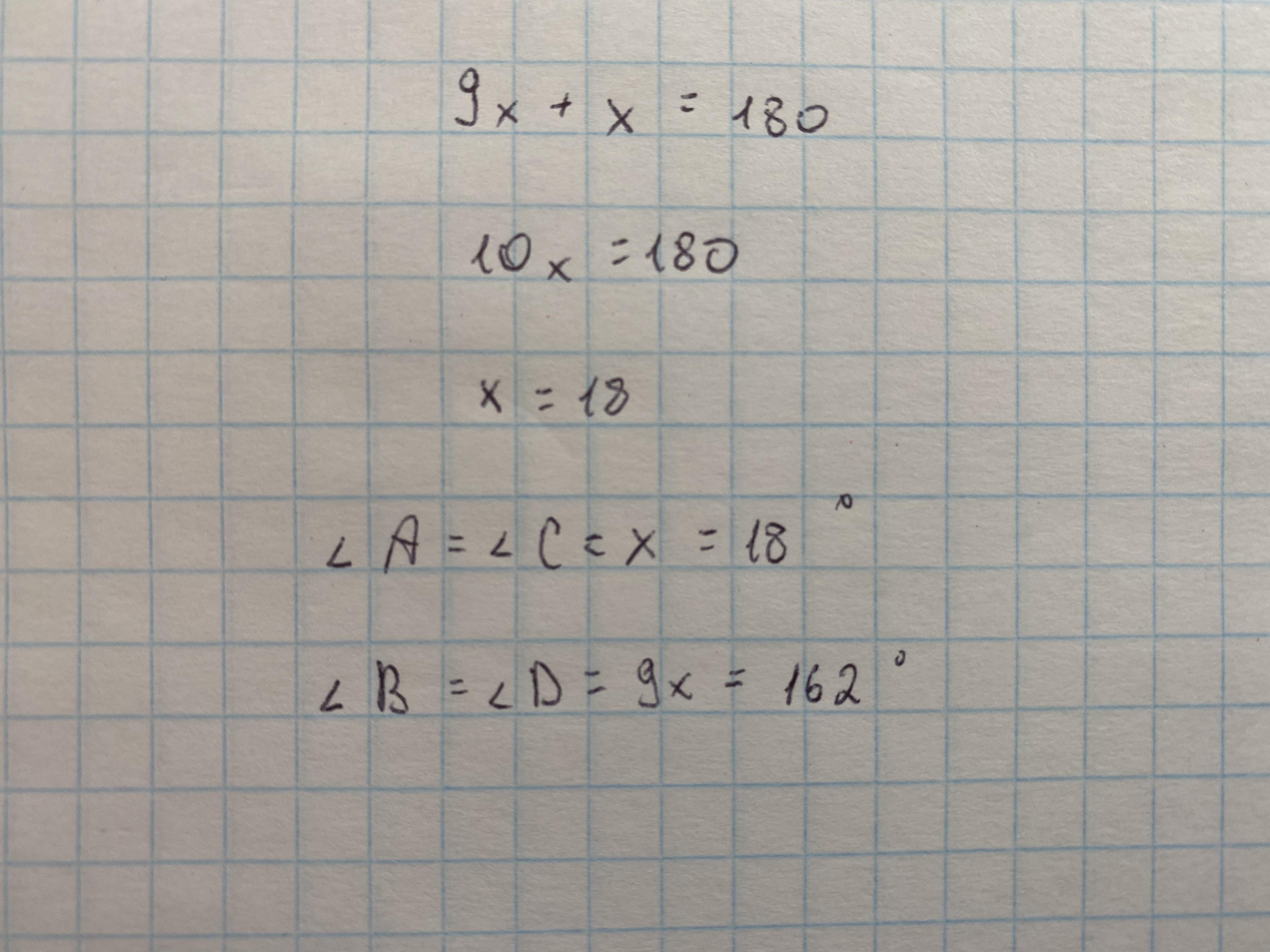 Пусть два противоположных угла будут равны х, тогда другие противоположные углы будут 9х. Сумма всех углов параллелограмма равна 360°. Составим уравнение: х+х+9х+9х=360; 20х=360; х=18. Значит, два угла равны по 18°, а другие по 9х=9*18=162°. Ответ: <А=18°; <В=162°; <С=18°; <D=162°.