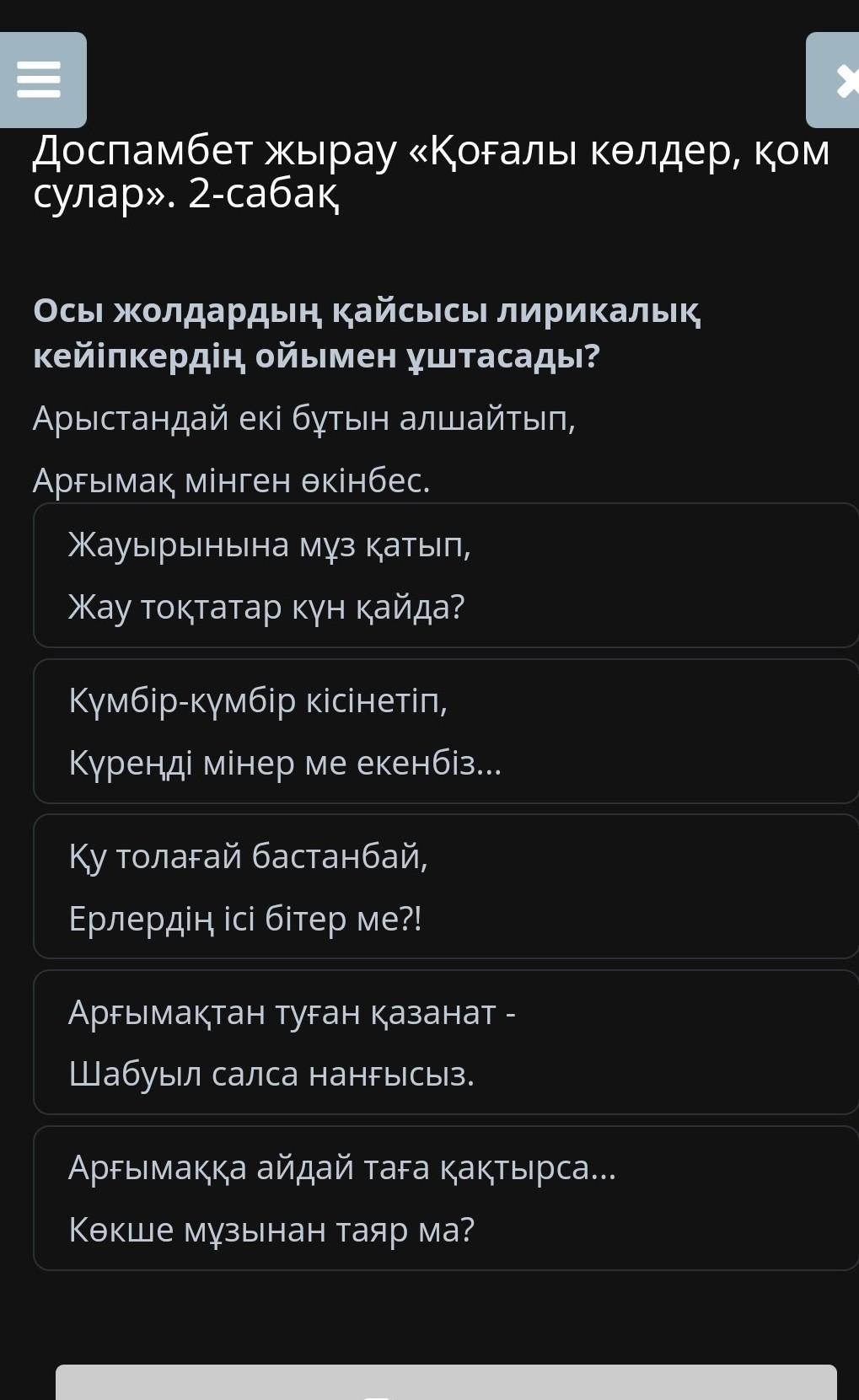 Осы жолдардың қайсысы лирикалық кейіпкердің ойымен ұштасады плиииз срочно
