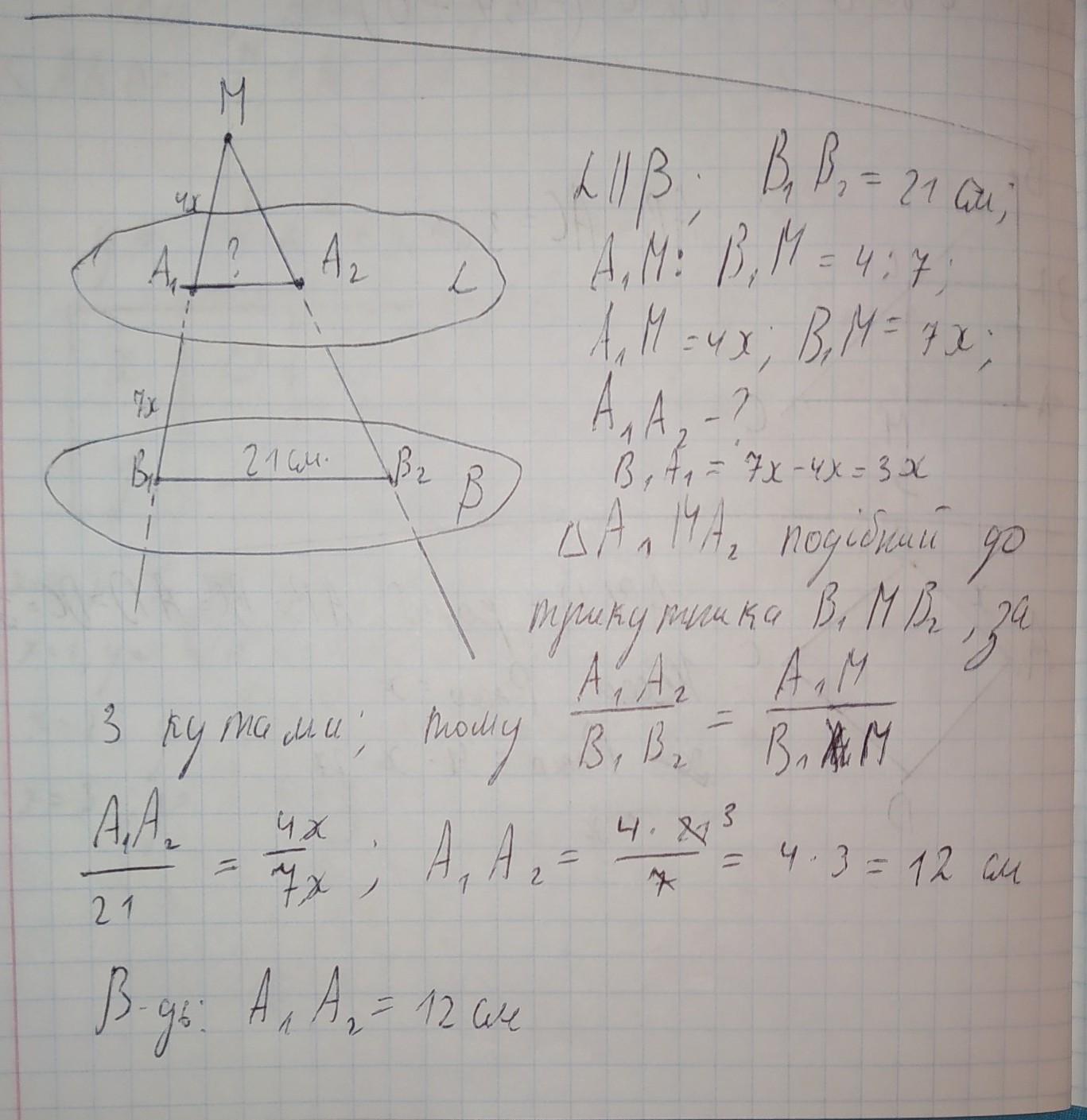 Через точку М яка не належить між двома паралельними площинами альфа і бета проведено дві прямі, які перетинають альфу в точках А1, і А2, а площину бета в точках В1 і В2 відповідно. Обчислити довжину відрізка А1 А2, якщо В1В2 дорівнює 21 см. і А1М відноситься В1М=4:7.