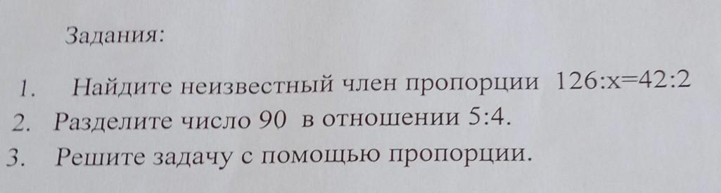 Задания: 1. Найдите неизвестный член пропорции 126:х=42:2 2. Разделите число 90 в отношении 5:4. 3. Решите задачу с помощью пропорции.