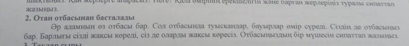 Отбасы деген сөздің өзіне терең үңіліп көрейікші. Ол біздің жанымыз жабырқағанда, қаунышқа бөленгенде ішкі тебіреністерімізді бөлісетін және өзімізді ең еркін, жайлы сезінетін баспана, жылы ұямыз. Отбасы шағын Отан. Оның басшысы отбасының қамқоршысы мен тіреуі – әке. Әке отбасына қатысты бар мәселелерді шешіп, өз отбасының намысын қорғау жолында бар күш-жігерін салады. Сондай-ақ, отбасы мүшелерінің де өзіндік атқаратын міндеттері бар. Баршамыздың осы ұядан ұшып шығатынымыз шындық. Отбасына деген сағыныштың жүрек түкпірінде мәңгілік сақталатыны, оның бізді ақ үрпек балапан шағымыз-дан жылы бауырына басатыны, бізді мәпелеп, өмірдің қатал заңына тәрбиелейтіні.