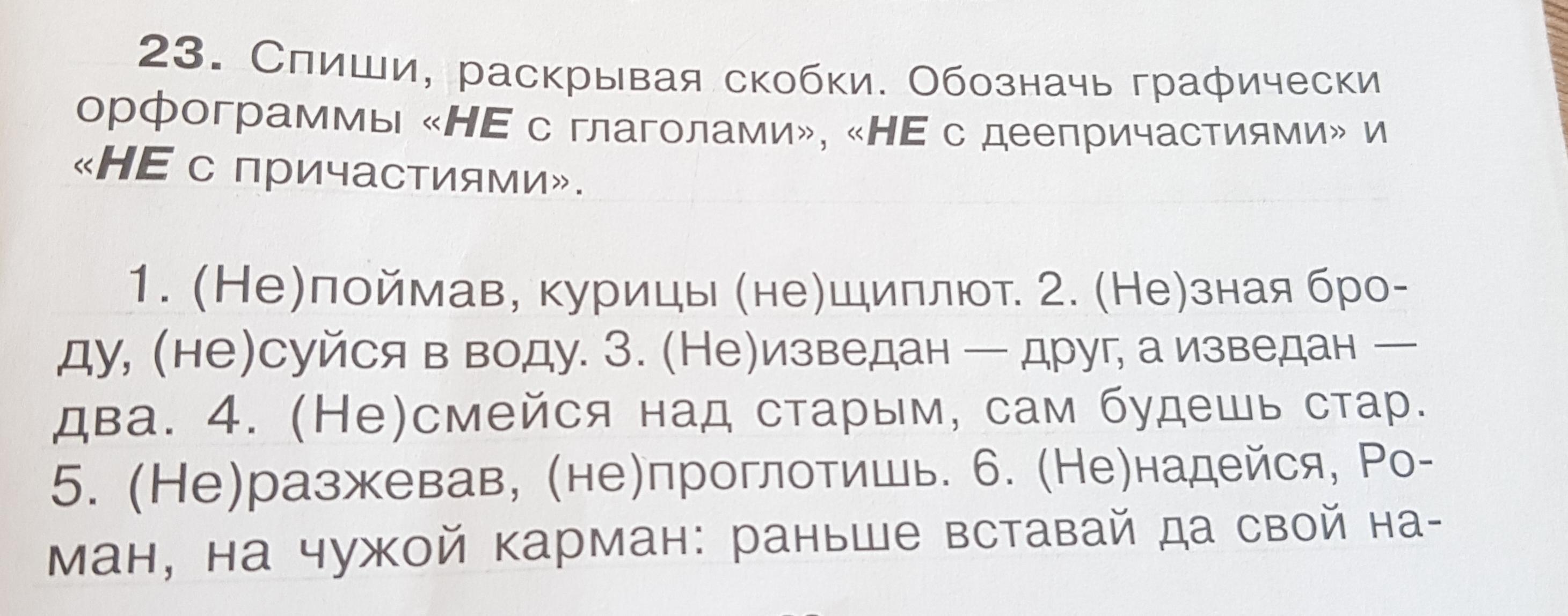 Не убив медведя,шкуры не продают. Не евший -легче,а поевший-лучше.Не кормя коня,недалеко уедешь. Не похваля, не продашь. Не бравшись за топор,избы не срубишь.Не пересказаны речи:сам видел с печи. Не поклонясь до земли,грибка не подымешь.Не веришь нам,попробуй сам.Не разгрызёшь ореха,так не съешь ядра.Не работая,сыт не будешь.2)Не поймав(дееприч),курицы не щиплют(Гл).Не зная(дееприч) броду,не суйся(Гл) во воду.Не изведан(Гл)-друг,а изведан-два.Не смейся(Гл) над старым,сам будешь стар.Не разжевав(дееприч),не проглотишь(Гл).Не надейся(Гл),Роман,на чужой карман;раньше да свой наживай.