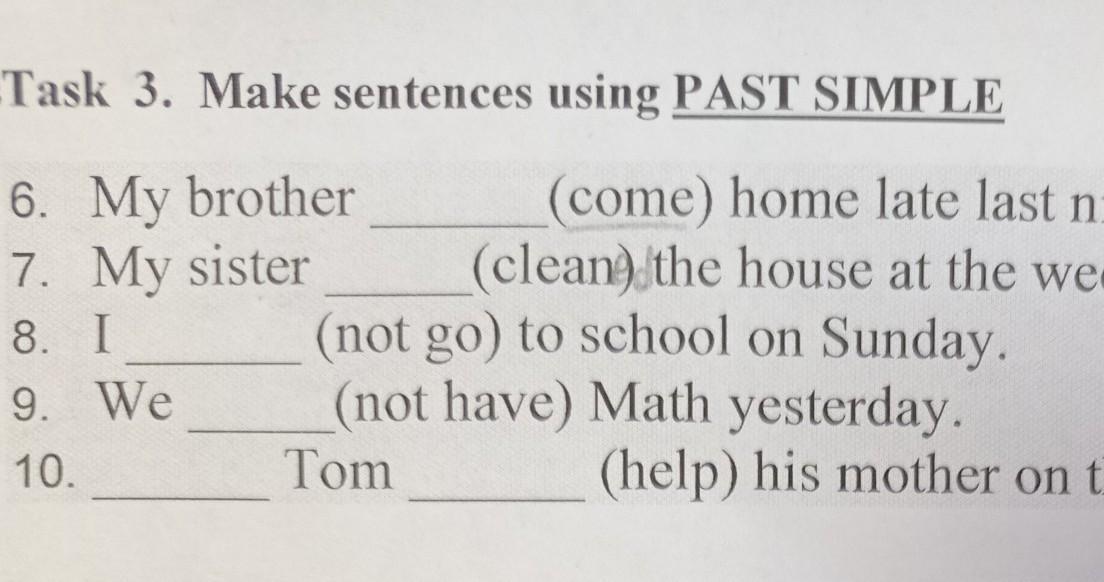 Task 3. Make sentences using PAST SIMPLE 6. My brother (come) home late last night. 7. My sister (clean) the house at the weekend. 8. I (not go) to school on Sunday. 9. We (not have) Math yesterday. 10. Tom (help) his mother on the 8th of March?
