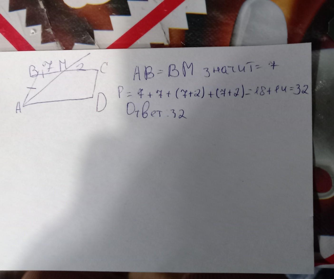 в паралелограмме ABCD проведена медиана AM которая делит сторону BC на стороны равные 7 и 2 см найдите периметр паралелорогмма