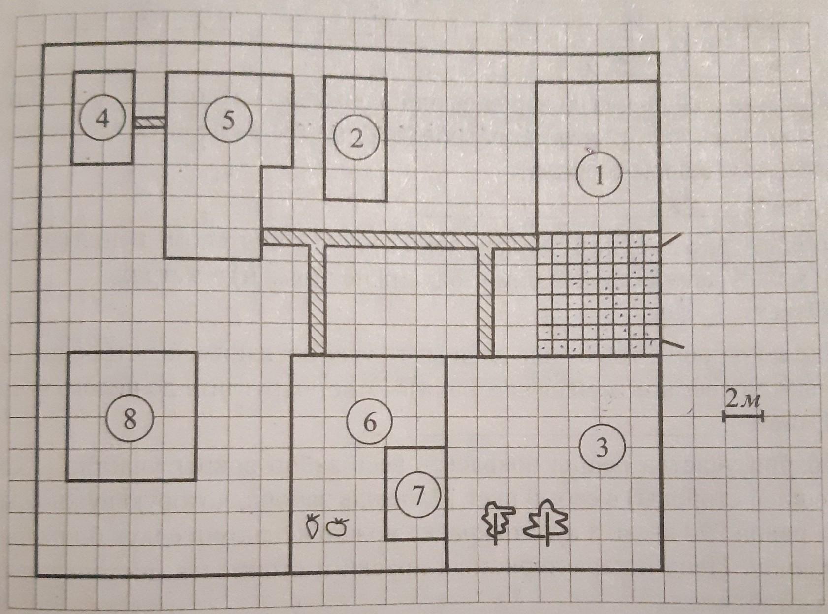 найдите расстояние от жилого дома до подсобного помещения (расстояние между двумя ближайшими точками по прямой) в метрах.