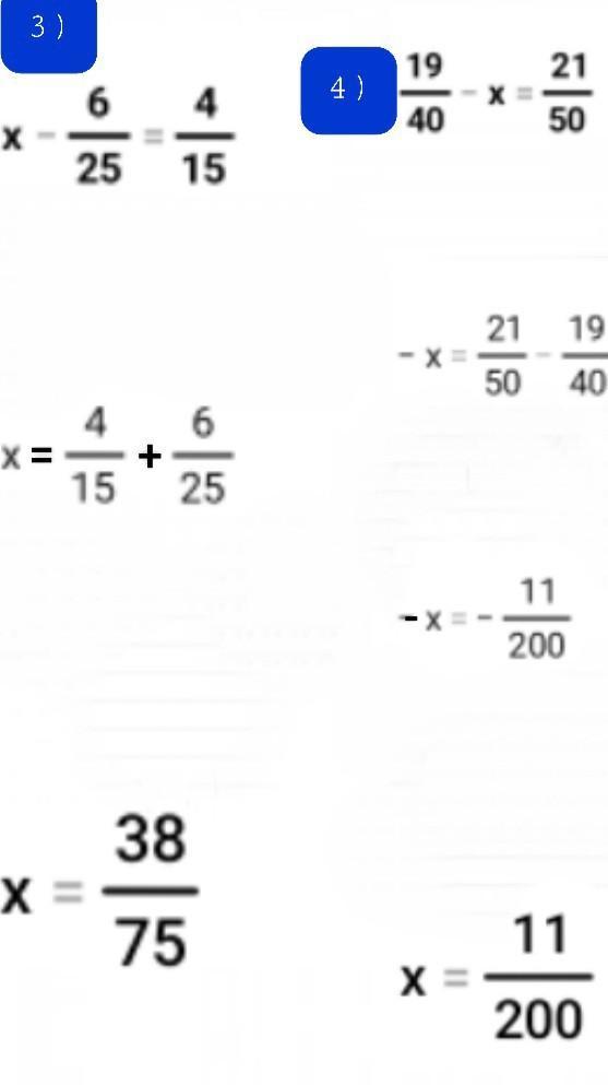 х-6/25=4/15. х=6/25+4/15. х=18/75+20/75 х=38/75