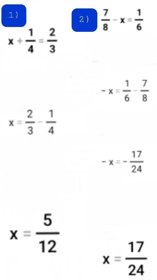 7/8-х=1/6. х=7/8-1/6. х=21/24-4/24. х=17/24
