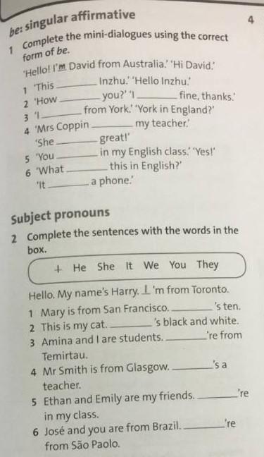 4 w 1 be: singularaffirmative Complete the mini-dialogues using the correct Hello / David from Australia.' 'Hi David. Inzhu." "Hello Inzhu.' How you?'' fоrm оf bе. This 2 fine, thanks from York.''York in England? 4 Mrs Coppin my teacher. "She great!" "You in my English class." "Yes!" 6 What ' yt a phone. 5 this in English? пжжжж пожалуйста помогите с первым заданием срочно только можно увидеться чтобы быстрей ребята мне нужно помочь только с первым заданием