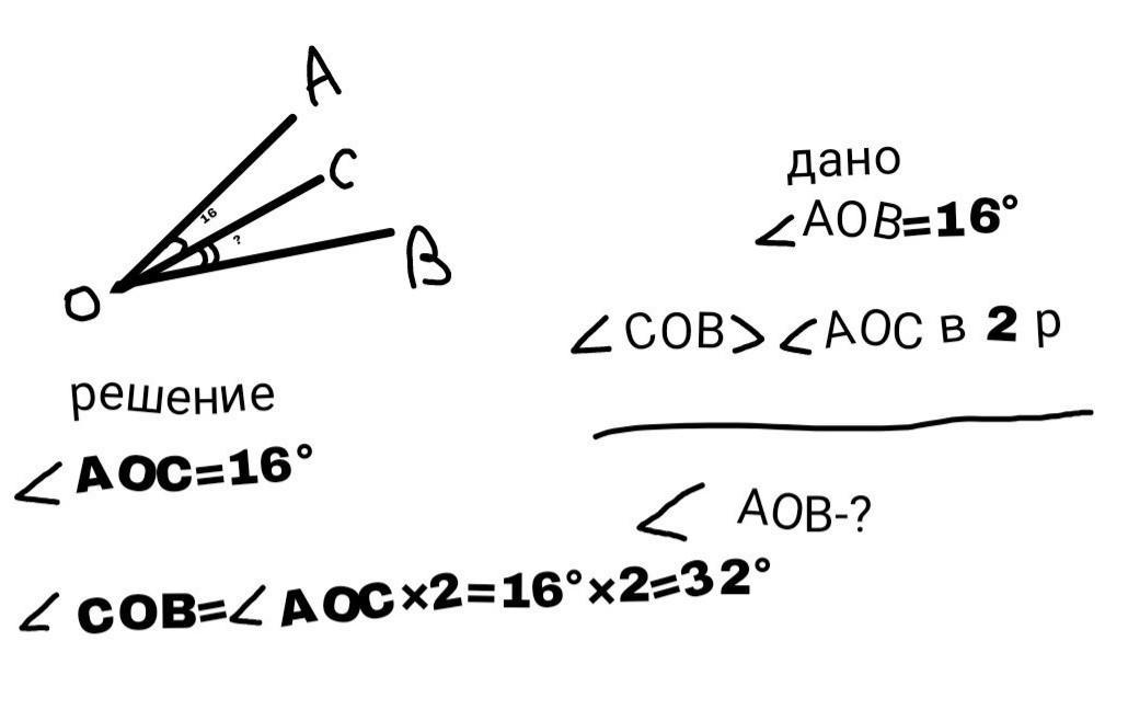a)Начерти угол AOB d)Внутри угла проведи луч OC c) Найдите велечену угла AOB, если угол AOC=16 градусов а угол COB в 2 раза больше угла AOC