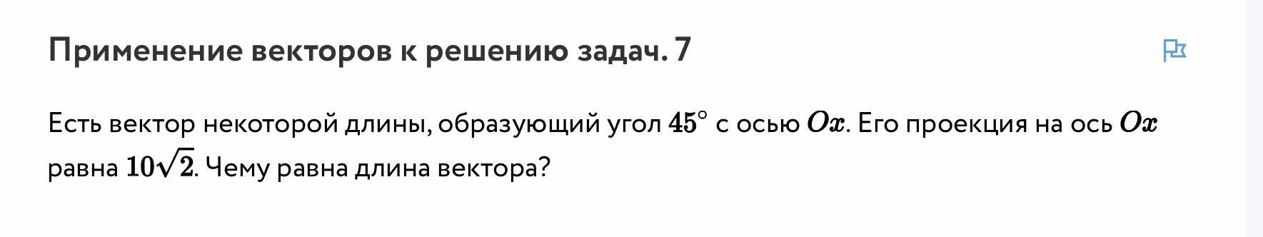 Есть вектор некоторой длины, образующий угол 45 с осью Ox. Его проекция на ось Ox равна 10корень из 2. Чему равна длина вектора?