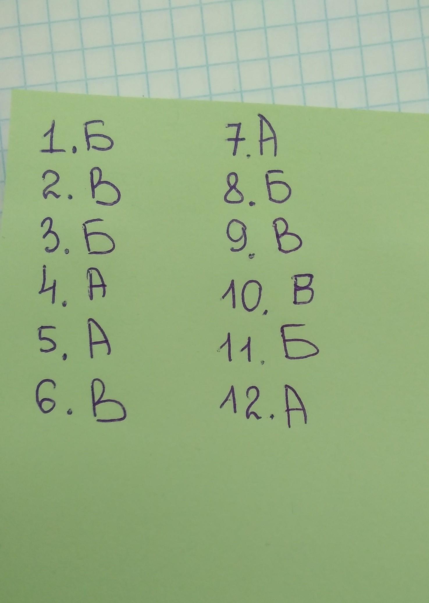 1.Б, 2.А,3.В,4.Б,5.А,6.Б,7.Б,8.В,9.А,10.Б,11.А.12.А