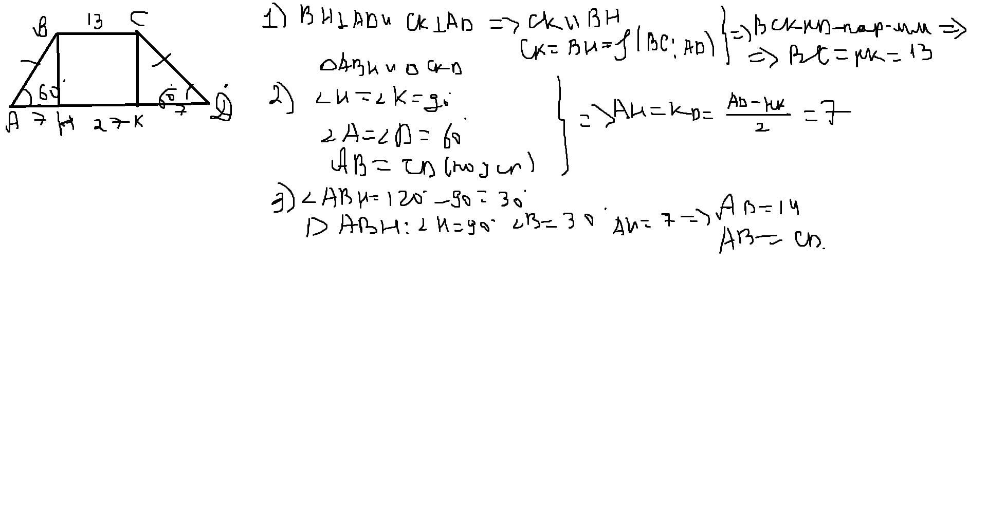 5. В равнобедренной трапеции АВСD углы прилежащие к стороне АD , равны 60. Найдите боковые стороны трапеции, если основания равны 13 см и 27 см.