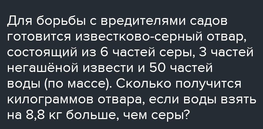 Чтобы найти, сколько получится килограммов отвара, если воды взять на 8,8 кг больше, чем серы, нужно для начала найти сколько кг приходится на 1 часть серного отвара: