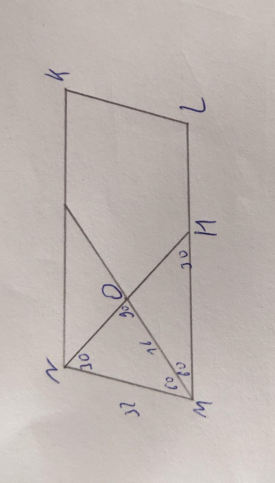 В параллелограмме M N K L биссектрисы углов M и N пересекаются в точке O таким образом, что MO=16 и <MNO=30 градусов. Найди сторону M N.