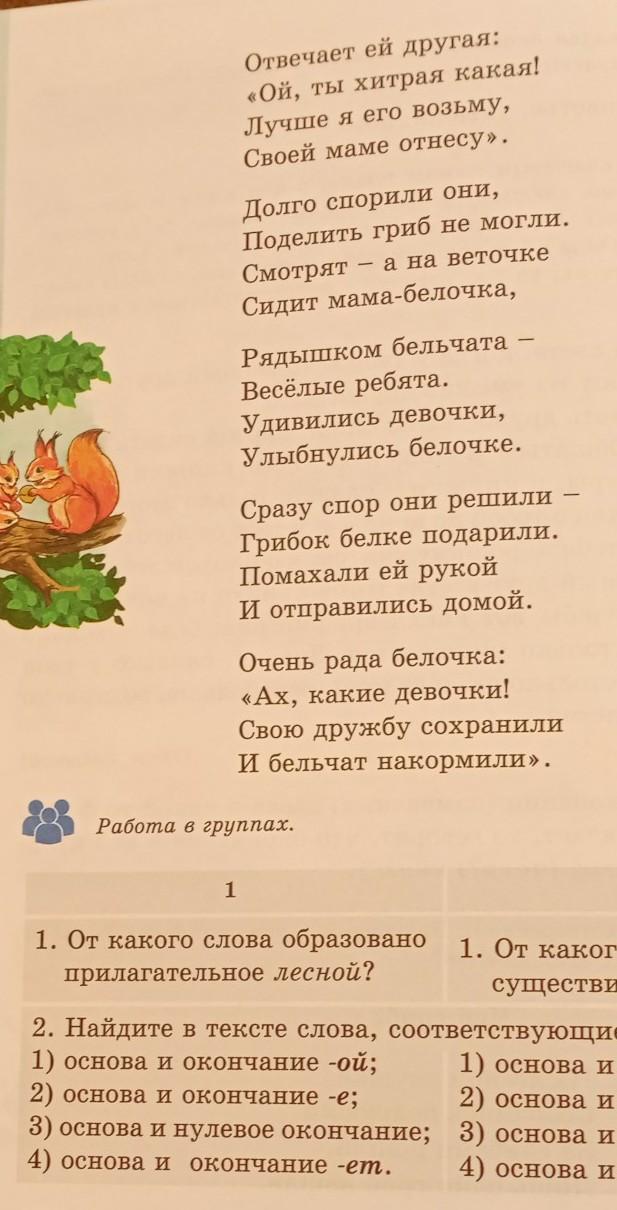 Работа в группах. 1 2 1. От какого слова образовано 1. От какого слова образовано прилагательное лесной? существительное белочка? 2. Найдите в тексте слова, соответствующие схемам: 1) основа и окончание -ой; 2) основа и окончание -e 3) основа и нулевое окончание; 3) основа и окончание -ет;