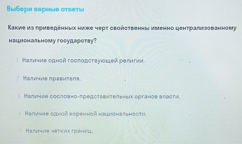 Выбери верные ответы Какие из приведенных ниже черт свойственны именно централизованному национальному государству?