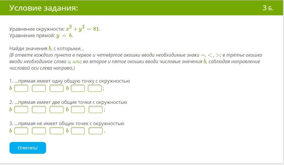 (В ответе каждого пункта в первое и четвёртое окошки вводи необходимые знаки =, < , >; в третье окошко вводи необходимое слово и, или; во второе и пятое окошки вводи числовые значения b, соблюдая направление числовой оси слева направо.)