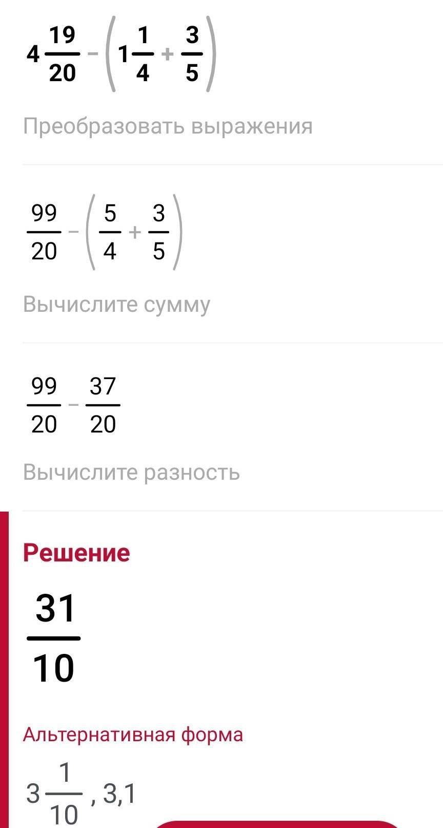 Выполните действия: 1) 4 целых 19/20 - ( 1 целая 1/4 + 3/5)