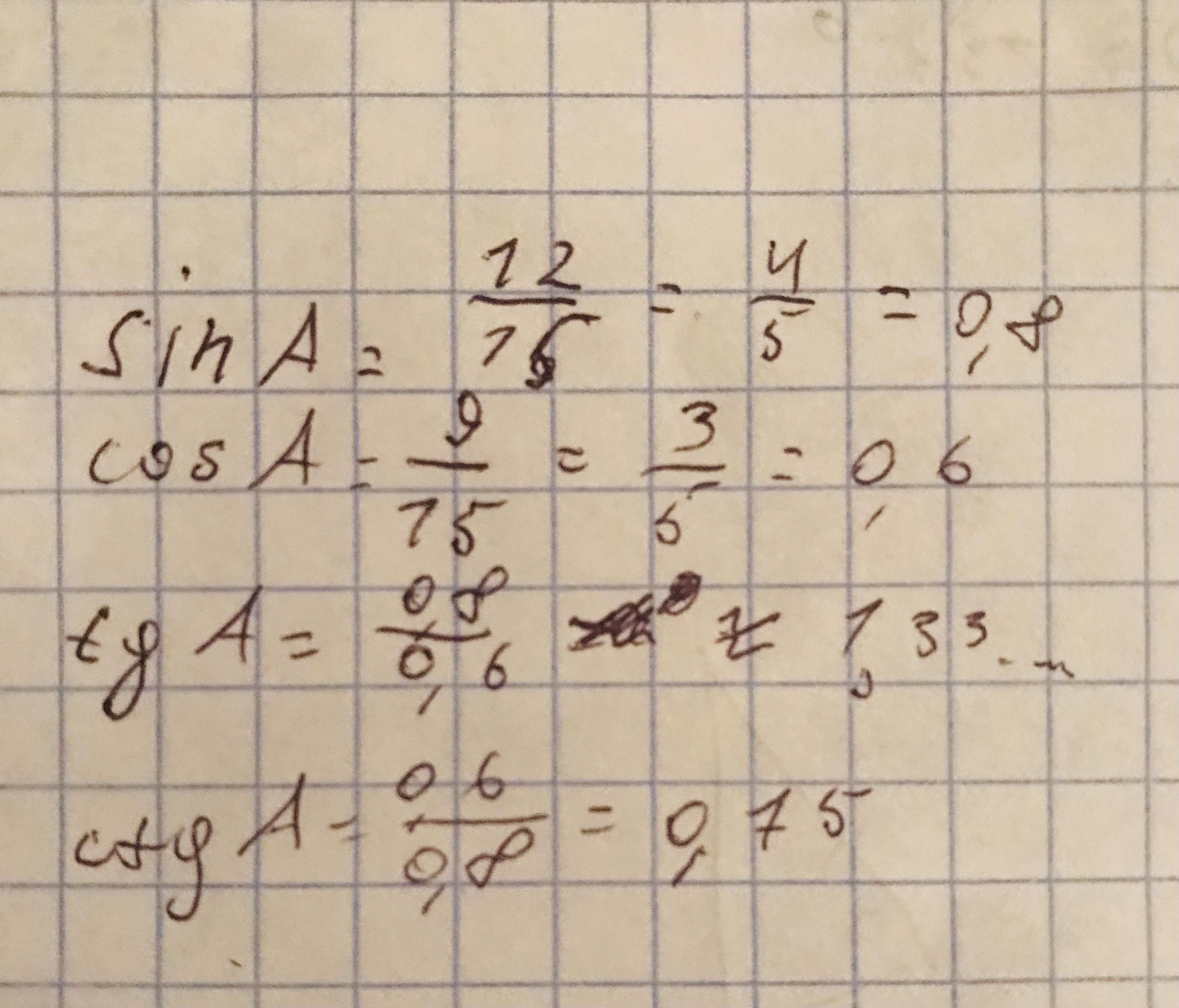Используя данные рисунка найдите синус, косинус, тангенс и котангенс угла A треугольника ABC с прямым углом C