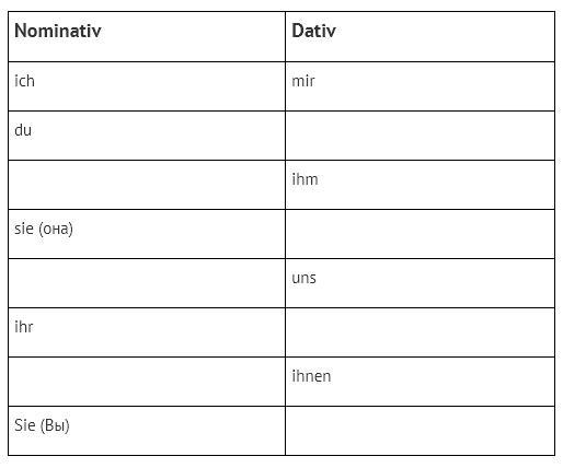 Ergänzen Sie die Personalpronomen im Nominativ und Dativ. Необходимо заполнить пропуски личными местоимениями в именительном и дательном падежах.