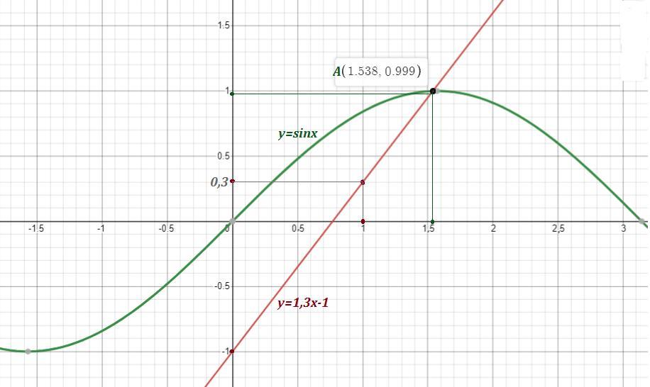 Точка пересечения графиков имеет координаты А(1,538;0,999) .