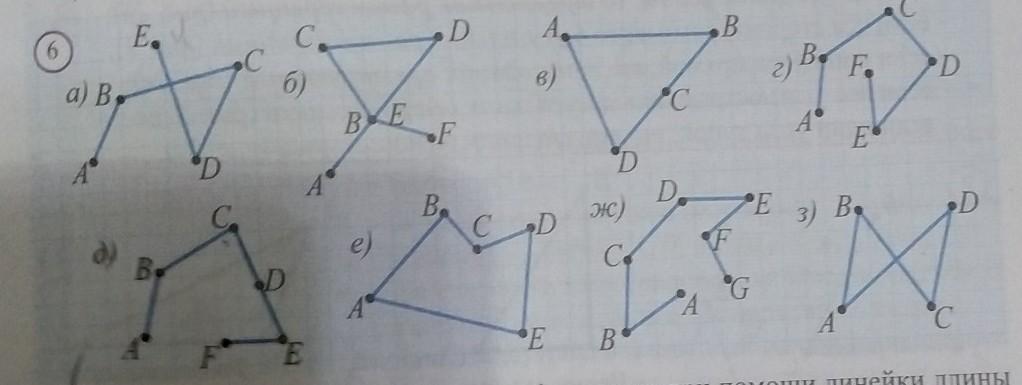 Какие из фигур на рисунке 6 являются а) ломаными; б) замкнутыми ломаными, . B) многоугольниками.