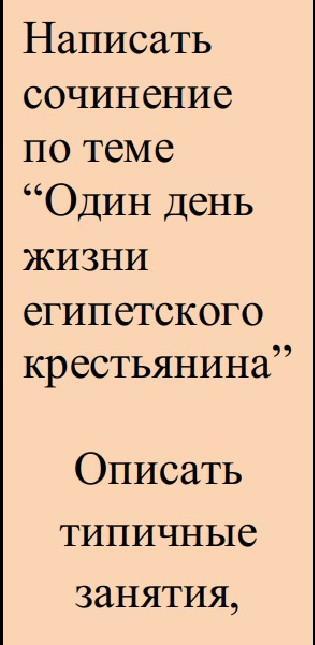 Крестьянину приходилось вставать рано, как только солнце всходило над священными водами Нила. Пока не настала изнуряющая жара нужно было в собственном саду недалеко от дома собрать смоквы, гранаты для завтрака. Совсем скоро наступит время собирать зерно. От того сколько удастся собрать зерна многое зависело в жизни крестьянина. Если зерна будет много, то он сможет заплатить обязательный налог, оставить себе, чтобы хватало всей его многочисленной семье. В удачные годы, когда зерна было много, крестьянин продавал зерно, или обменивал его на домашних животных или красивые ткани для своей жены и дочерей. Чтобы обеспечить себя всем необходимым крестьянину приходилось трудиться до самого заката солнца.