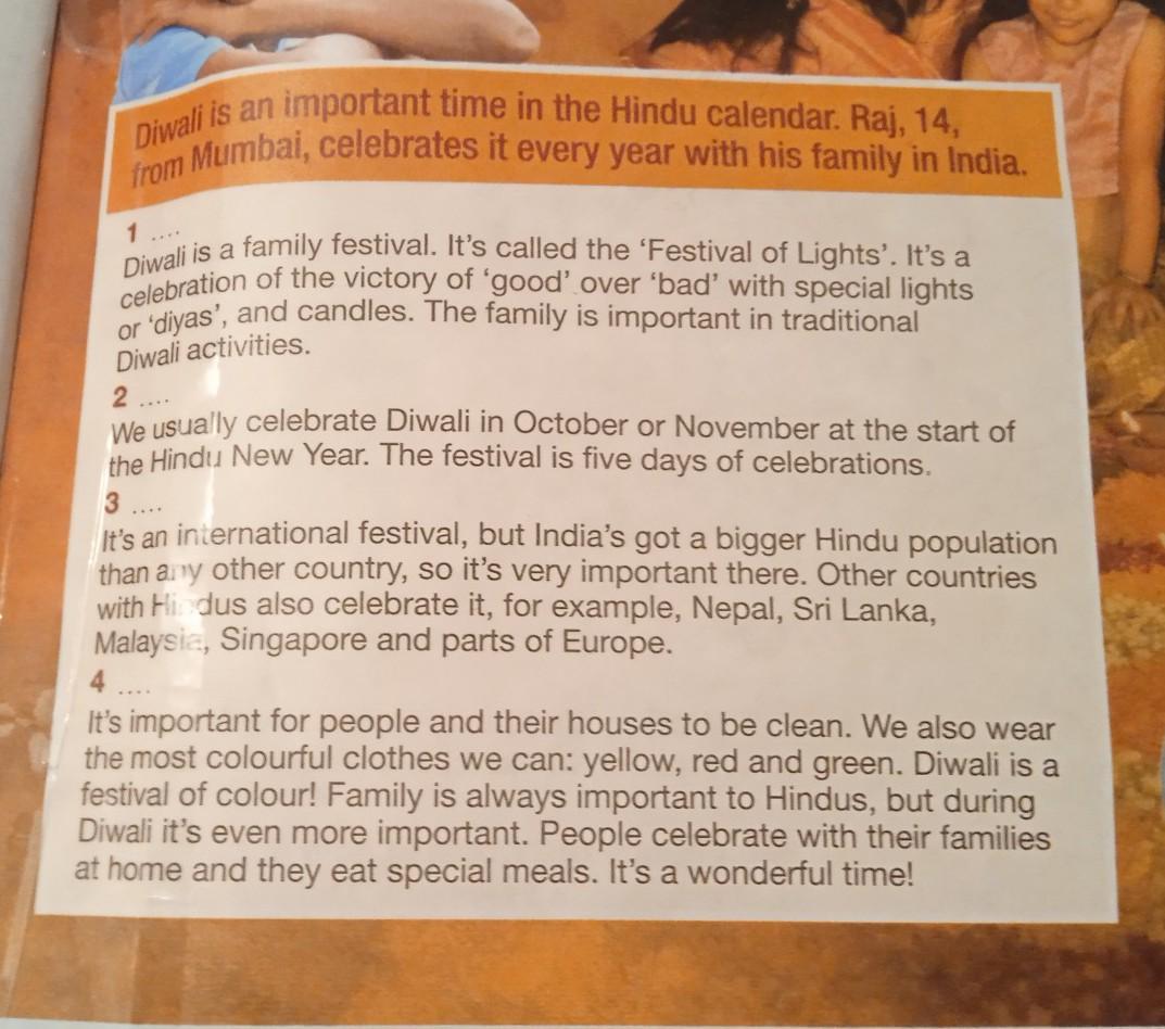 a 4 Reed the text again. Choose the correct answers. 1 Diwali is a celebration of the family / good. 2 'Diyas' are special lights / candles. 3 People celebrate for two months / five days during Diwali. 4 People all over the world / Only Indian people celebrate Diwali. 5 Colourful clothes / houses are very important at Diwali time.