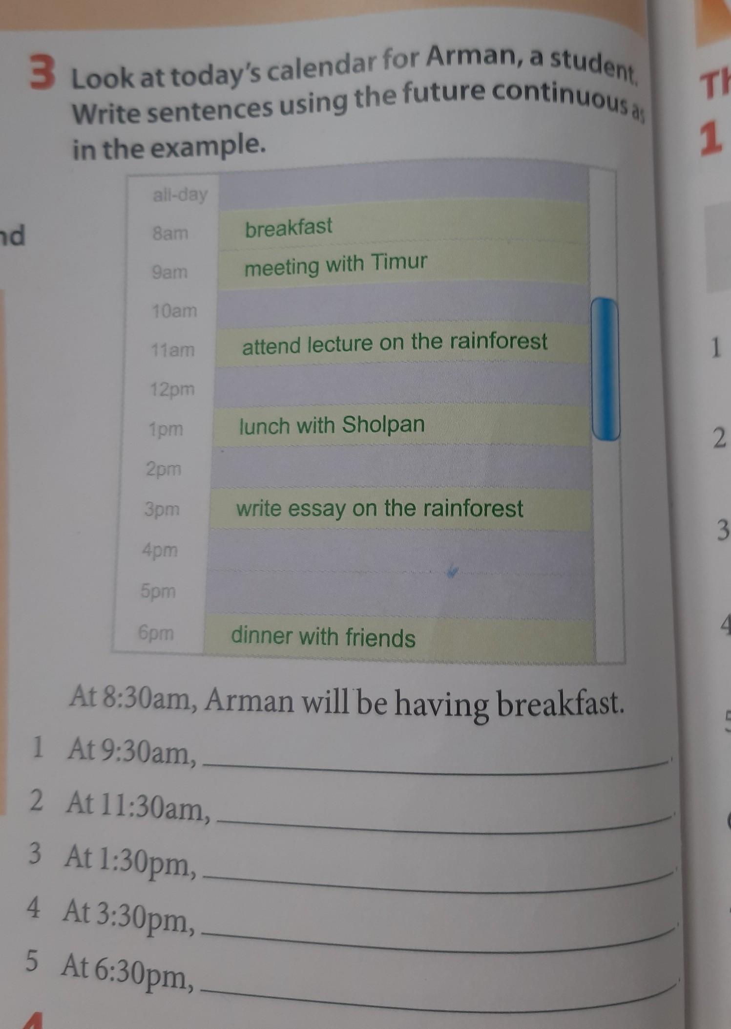 At 3:30pm he will be writing essay on the rainforest.