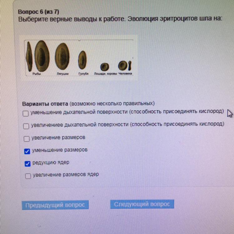 Эволюция эритроцитов у позвоночных животных шла в направлении уменьшения размеров и отсутствия ядра в зрелых клетках.