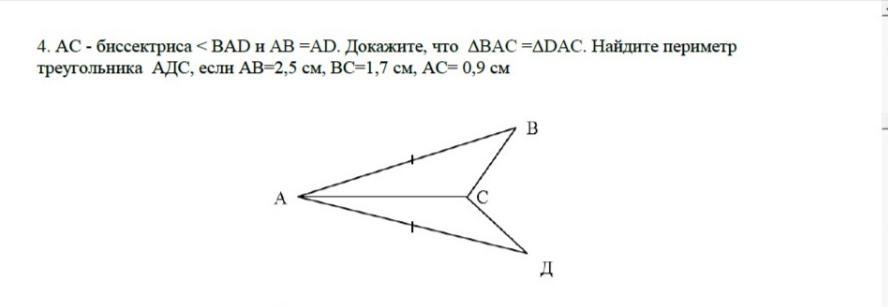 4. АС - биссектриса <ВАD и АВ =АD. докажите что BAC=DAC. Найдите периметр треугольника АДС, если АВ=2,5 см, ВС=1,7 см, АС=0,9 см