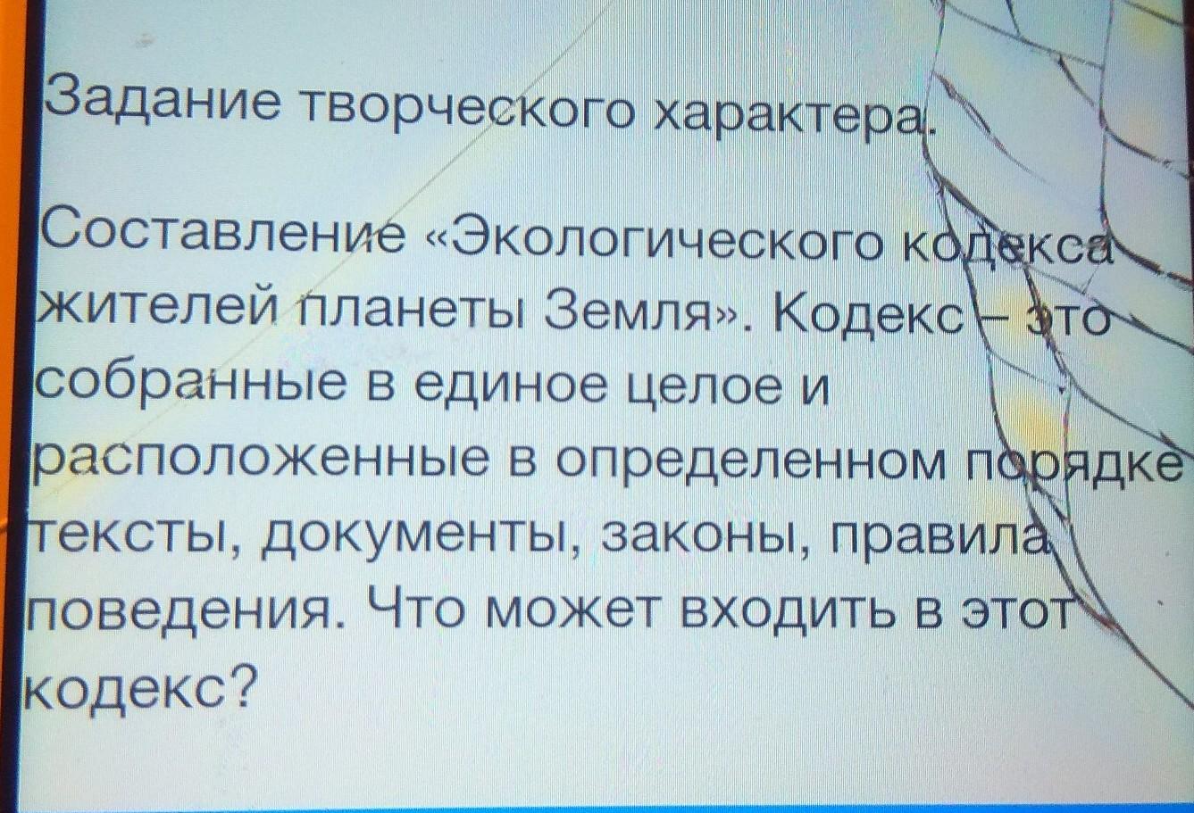 Задание творческого характера. Составление «Экологического кодекса жителей планеты Земля». Кодекс - это собранные в единое целое и расположенные в определенном порядке тексты, документы, законы, правила поведения. Что может входить в этот кодекс?