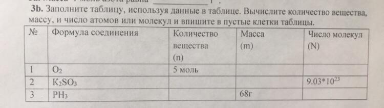 заполните таблицу,используя данные в таблице. Вычислите количество вещества,массу,и число атомов или молекул и впишите в пустые клетки таблицы