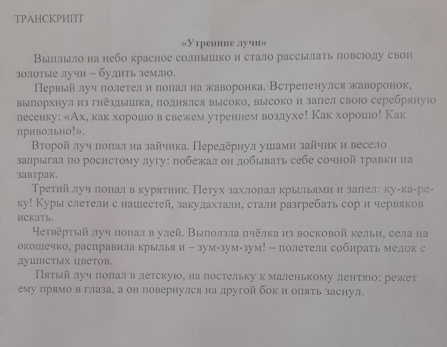 Красное солнышко, золотые лучи, первый луч, серебряную песенку, второй луч , росистосу лугу , сочной травки , третий луч, четвёртый луч, восковой кельи, душистых цветов , пятый луч , маленькому лентяю.