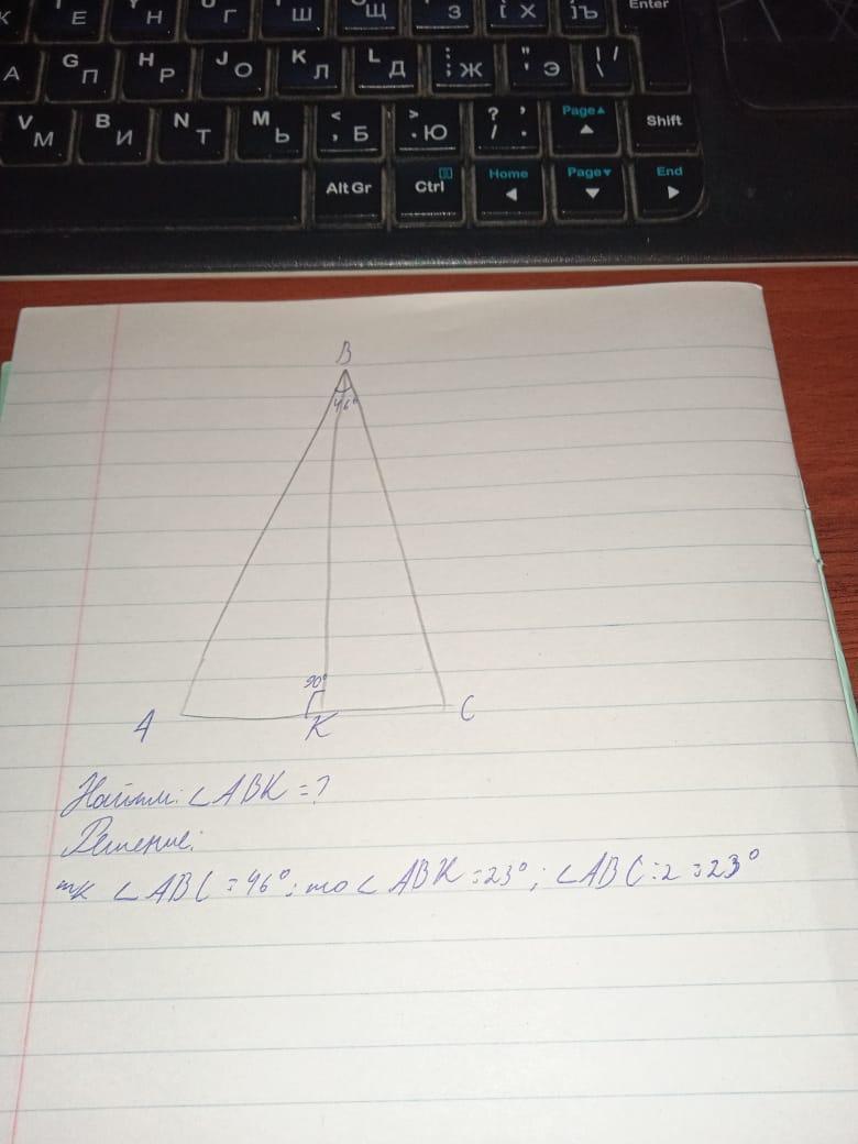равнобедренном треугольнике АВС с основанием АС проведена высота ВК. Угол АВС = 46 градусов. Найдите градусную меру угла АВК