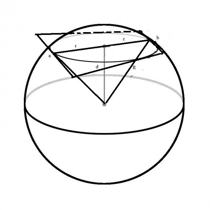 Пусть шар радиусом R=5см пересекает плоскость равнобедренной трапеции с основаниями a=8√2см и b=4√2см так, что сечение шара касается всех сторон этой трапеции. Сечение шара - окружность радиуса r, она является вписанной в равнобедренную трапецию.