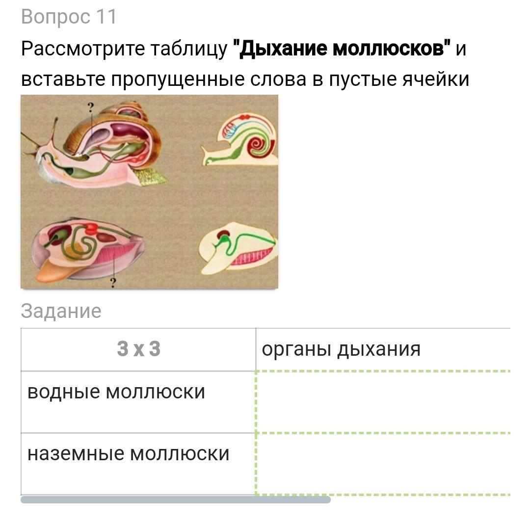 Рассмотрите таблицу "Дыхание моллюсков" и вставьте пропущенные слова в пустые ячейки