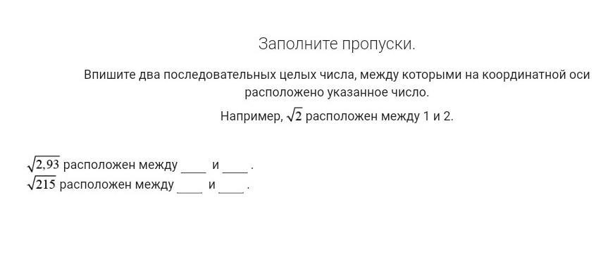 Заполните пропуски. Впишите два последовательных целых числа между которыми на координатной оси расположено указанное число.